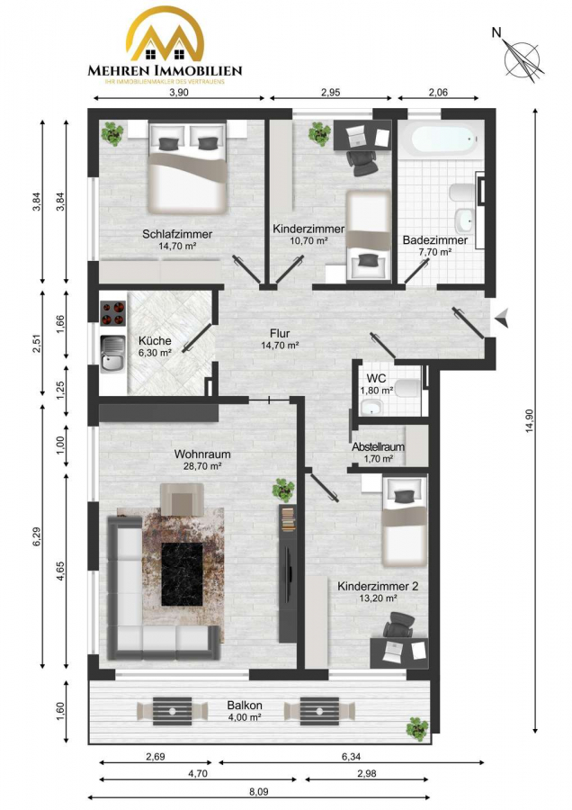 4 Zimmer: Wohnzimmer + 3 Schlafzimmer